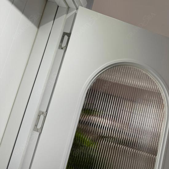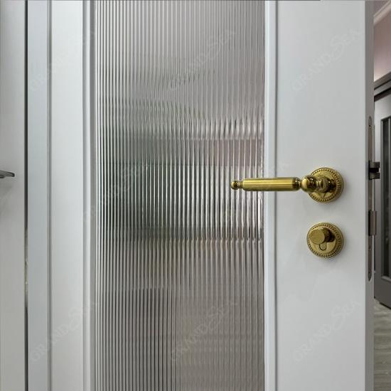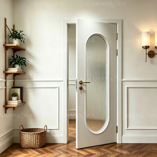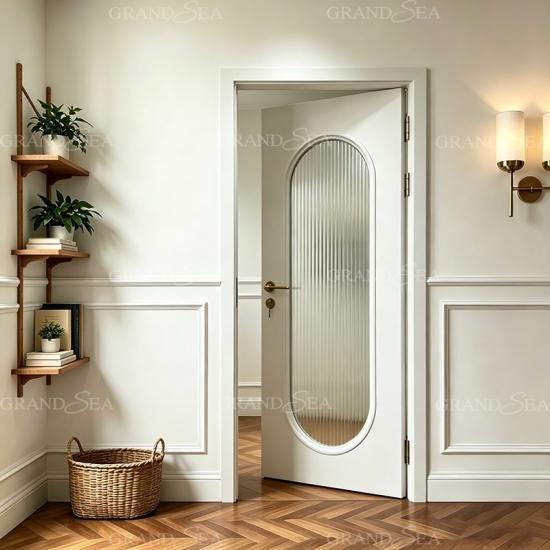 This wood plastic indoor door features a white panel paired with oval-shaped fluted glass, using high wood plastic composite board with brass-finish hardware handles, the doors open smoothly and Mute. The door panels feature a stain-resistant surface treatment, allowing everyday water marks and oil stains to be wiped away instantly.