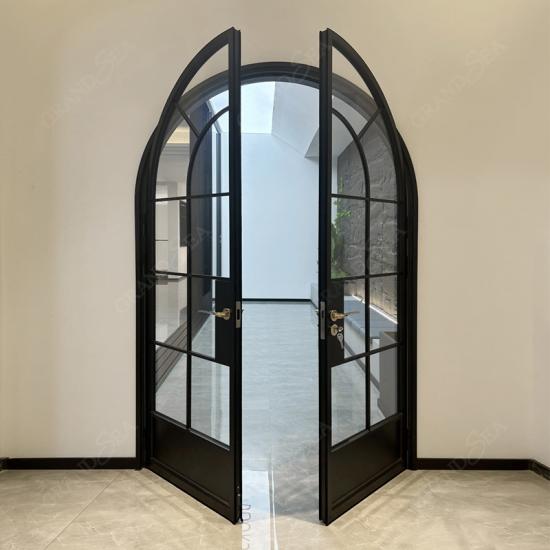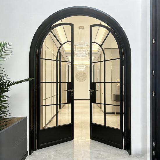 This high-end arched French double door features a black aluminum alloy frame and grille glass design, It is also equipped with a high-security locking system, ensuring both anti-theft protection and thermal insulation performance. The door body is crafted from 6063-T5 extruded aluminum and finished with a highly weather-resistant powder coating process; not only is it exceptionally durable, but it is also ideally suited for use in villas, residential homes, and interior spaces.