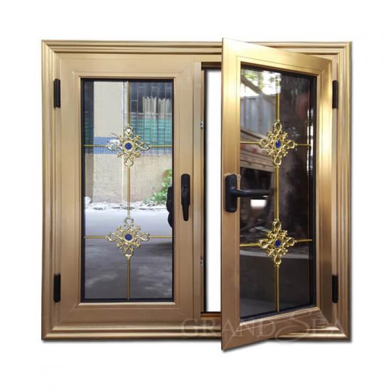 Aluminum swing window also called aluminum casement window, this window golden color work by electroplate, stable and longtime using. Double tempered glass use one level clear and one level reflective glass keep the room privacy, also put the golden flower design inside for fashion design.