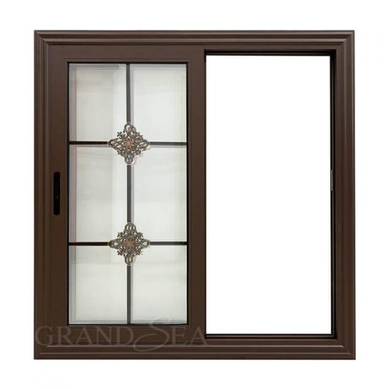 Aluminum sliding windows with powder coated coffee brown color and double glazing. The decorative flowers design inside double glazing make the window special and nice, very good for using as residential house interior windows. The 2 tracks frame also can add strong or soft mosquito net for anti-insect and burglar proof.