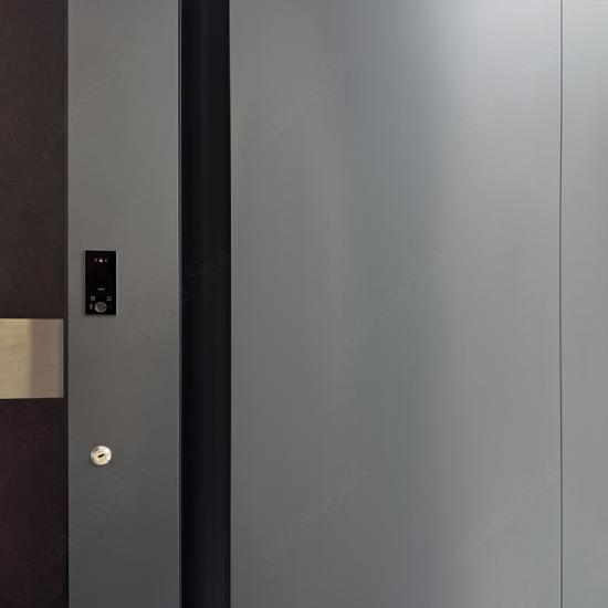 This black residential pivot door features a hidden design, utilizing aluminum alloy material and concealed hinges, allowing it to blend almost seamlessly into the wall. It also includes a hidden long handle, doorbell and multi-point .You can also customize your own unique pivot doors, please contact us.